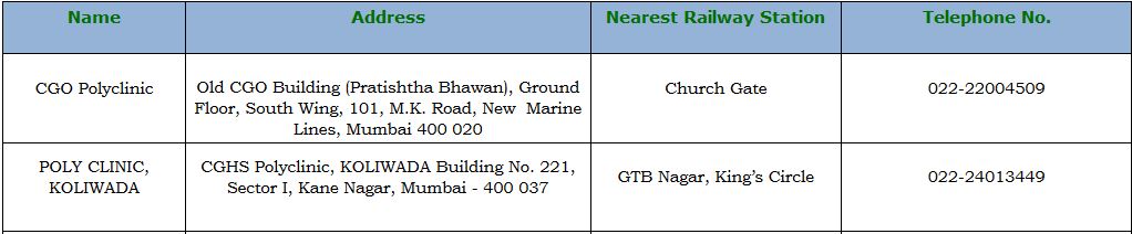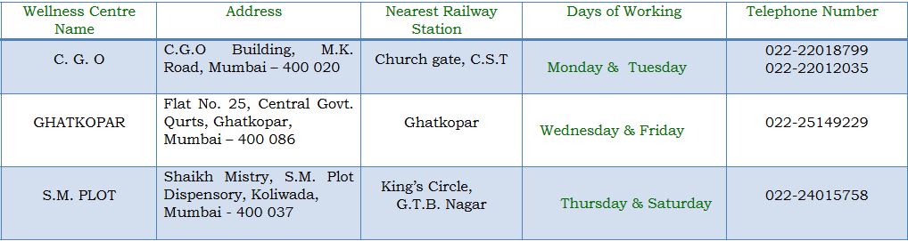 In Mumbai, Central Government Health Scheme was started in 1963. CGHS started in Mumbai with just 7 dispensaries. Now there are 26 wellness centers, 3 Homoeopathic units, 2 Ayurvedic dispensaries and 2 Polyclinics. CGHS cover up to Goregaon on Western side, up to Mankhurd on the Harbour line side and up to Mulund on the Central side. As on now there are more than 90 thousand CGHS cardholders and approx. 3.5 lakh CGHS beneficiaries in Mumbai.